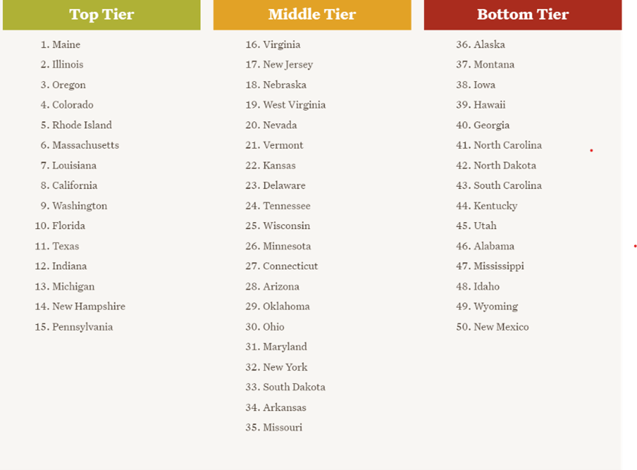 There is even a system that ranks states’ animal protection laws. The ranking is produced annually by the Animal Legal Defense Fund (ALDF), a national nonprofit that uses the legal system to protect animals and improve animal welfare. Here is a graphic showing the 2020 ranking results: