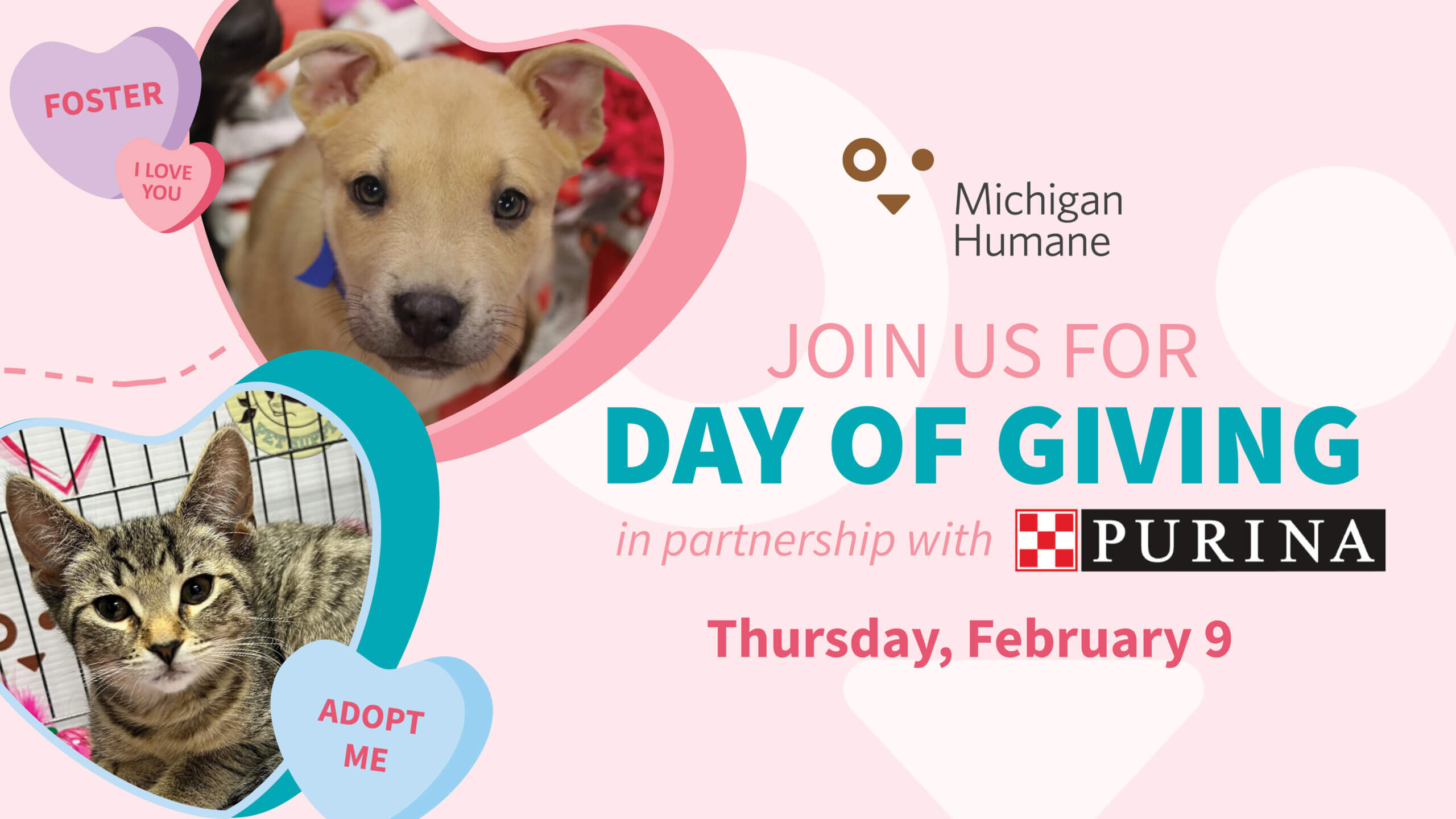 The 2023 Michigan Humane Day of Giving Telethon, in partnership with Purina, kicks off Thursday, February 9 starting at 6 a.m. Tune in to Fox 2, WDIV Local 4 and WXYZ Channel 7 to watch inspiring stories of animal rescues in our communities! Your support is what makes these rescues possible. Donate to the 2023 Michigan Humane Day of Giving Telethon to help change lives.