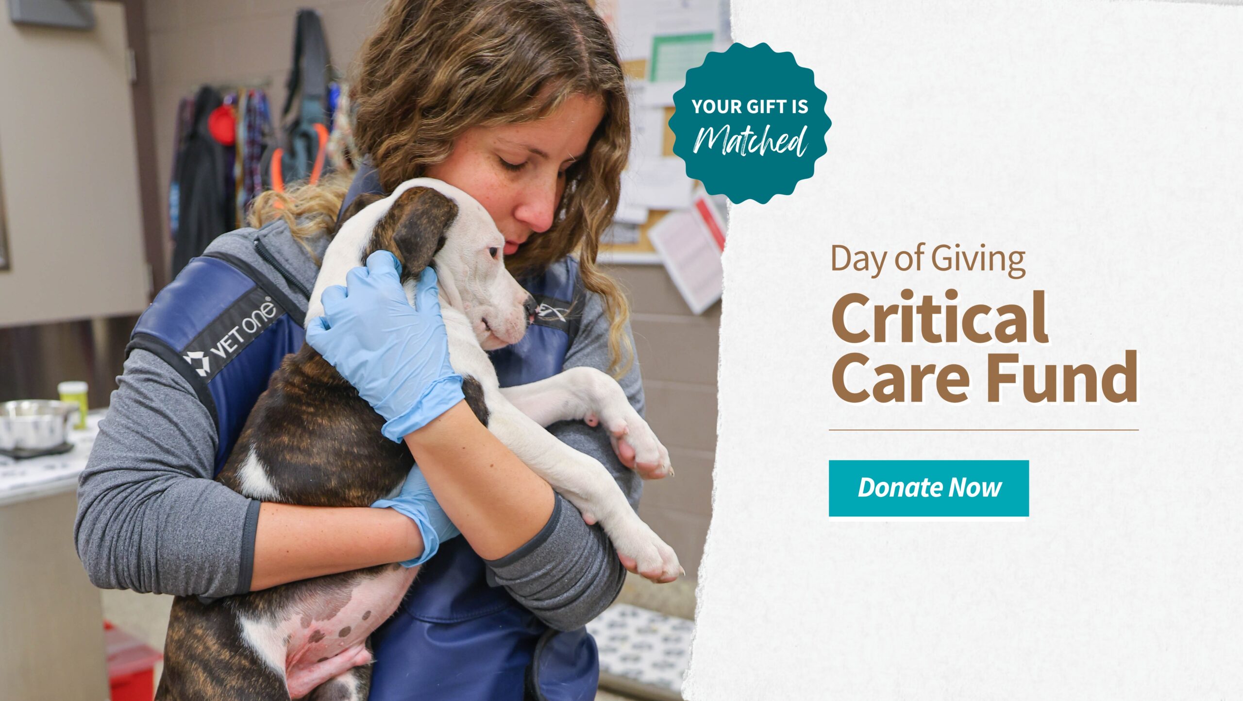 Purina’s $70k matching gift means your donation to the Critical Care Fund is DOUBLED. Make TWICE the impact for every dollar you give. The need for emergency veterinary services has never been greater. Make a gift to replenish the Critical Care Fund today and your donation will be DOUBLED for TWICE the lifesaving care in 2025.
