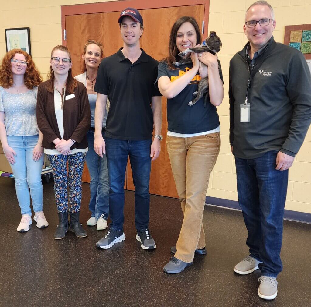 Recently, we had the pleasure of hosting two Michigan legislators (Sen. Dayna Polehanki and Rep. Kevin Coleman) and three legislative staff members (from the offices of Rep. Jason Hoskins and Rep. Jimmie Wilson, Jr.) for a tour of our Berman Center for Animal Care in Westland. These tours are an opportunity for the visiting lawmakers and staff members to learn more about our programs and services. President & CEO Matt Pepper led the tour of our shelter and veterinary center. Our guests asked great questions and had the opportunity to meet staff, volunteers, and animals, including Gaylord, an adoptable puppy. We also had the opportunity to update them about our current legislative initiatives.