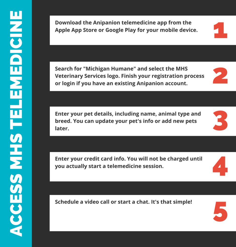 Michigan Humane understands that our lives are full of uncertainty as we go through the COVID-19 crisis. That’s why we’ve partnered with Anipanion to offer certain veterinary services through the convenience of telemedicine. Consulting with a Michigan Humane vet is now at your fingertips!